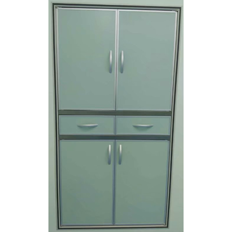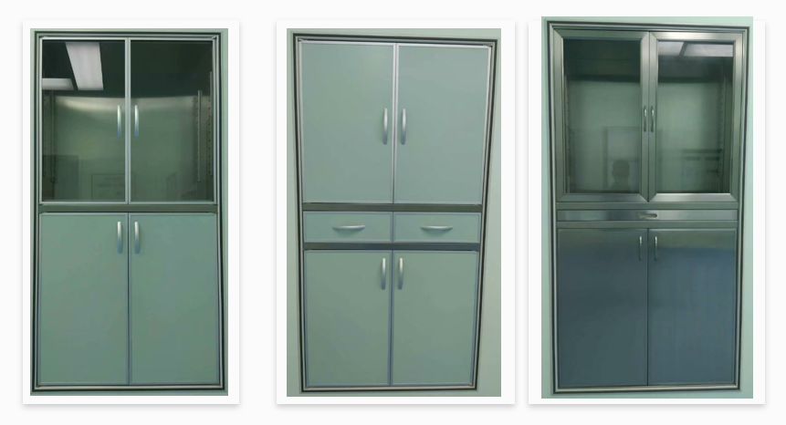 嵌入式药品柜、器械柜、麻醉柜采用国际标准制作,整体柜体采用SUS304不锈钢材质,柜门为与手术室墙板同颜色镀锌板喷粉或不锈钢,整柜表面平整美观,安装简易,符合国内手术室规范,便于器材管理。